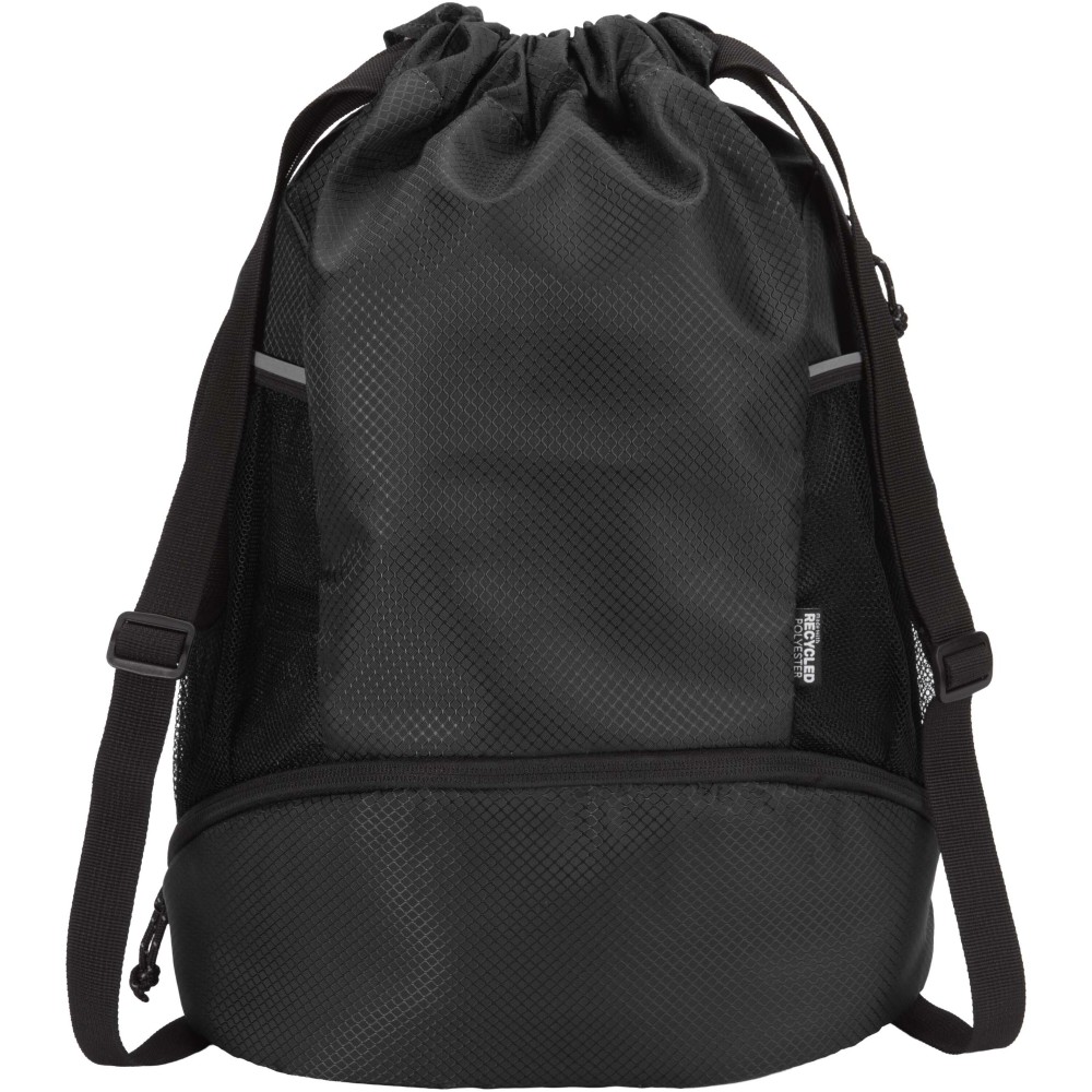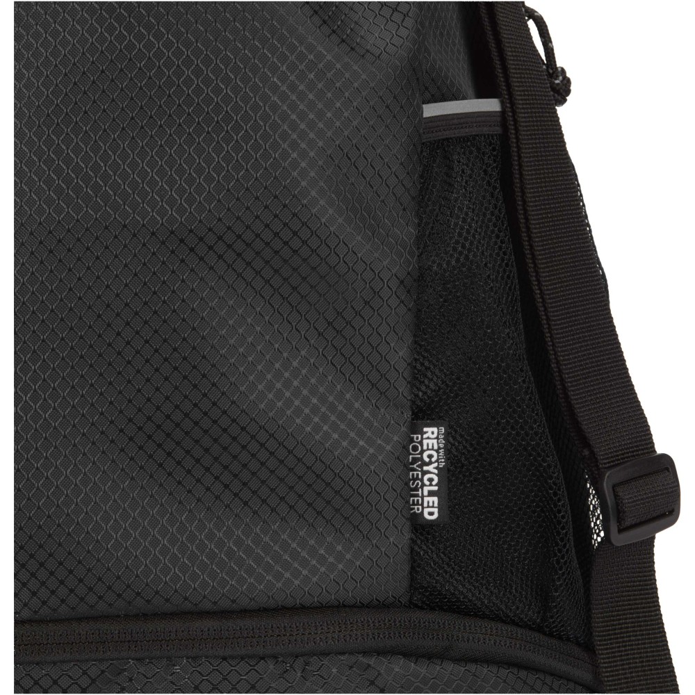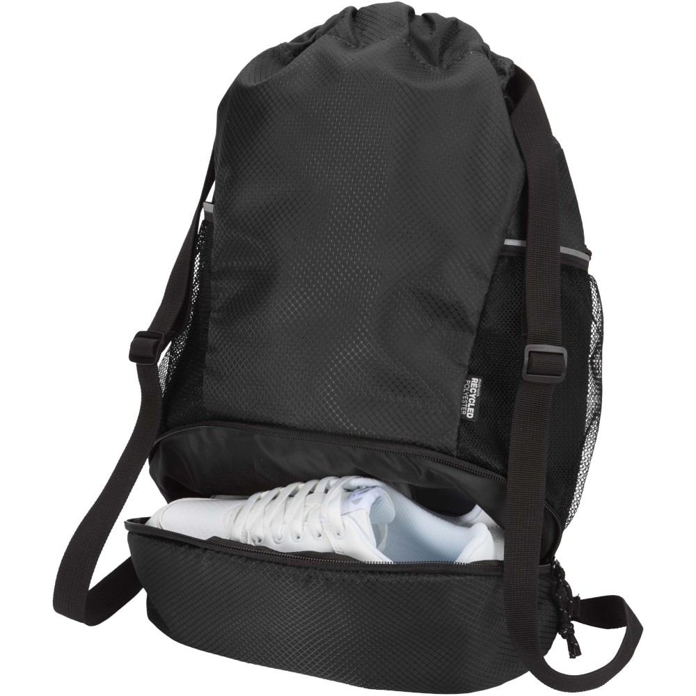 A Nomad sport húzózsinóros táska GRS tanúsítvánnyal rendelkező, újrahasznosított ripstop anyagból készült, vízlepergető felülettel, GRS tanúsítvánnyal rendelkező RPET béléssel és fényvisszaverő elemekkel. Aktív életmódot folytatók számára tervezték, ideális a mindennapi edzéshez és sporttevékenységekhez. Tágas fő rekesze: elfér benne ruházat, törölköző vagy akár egy kosárlabda is. Külön alsó rekesze biztosítja a cipők vagy használt ruhák elkülönített tárolását. Két oldalsó hálós zsebbel rendelkezik fényvisszaverő részletekkel, egy rejtett cipzáras zsebbel az értékek számára, valamint állítható hevederpántokkal a kényelmes hordozás érdekében.