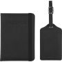 Újrahasznosított PU anyagból készült útlevéltartó és poggyászcímke, illusztrációval ellátott barna kartondobozban. Az útlevéltartó elülső oldalán "Passport" felirat található, belül két rekesszel az útlevél biztonságos rögzítéséhez. Mindkét terméken dombornyomott, újrahasznosított alapanyagra utaló logó található.