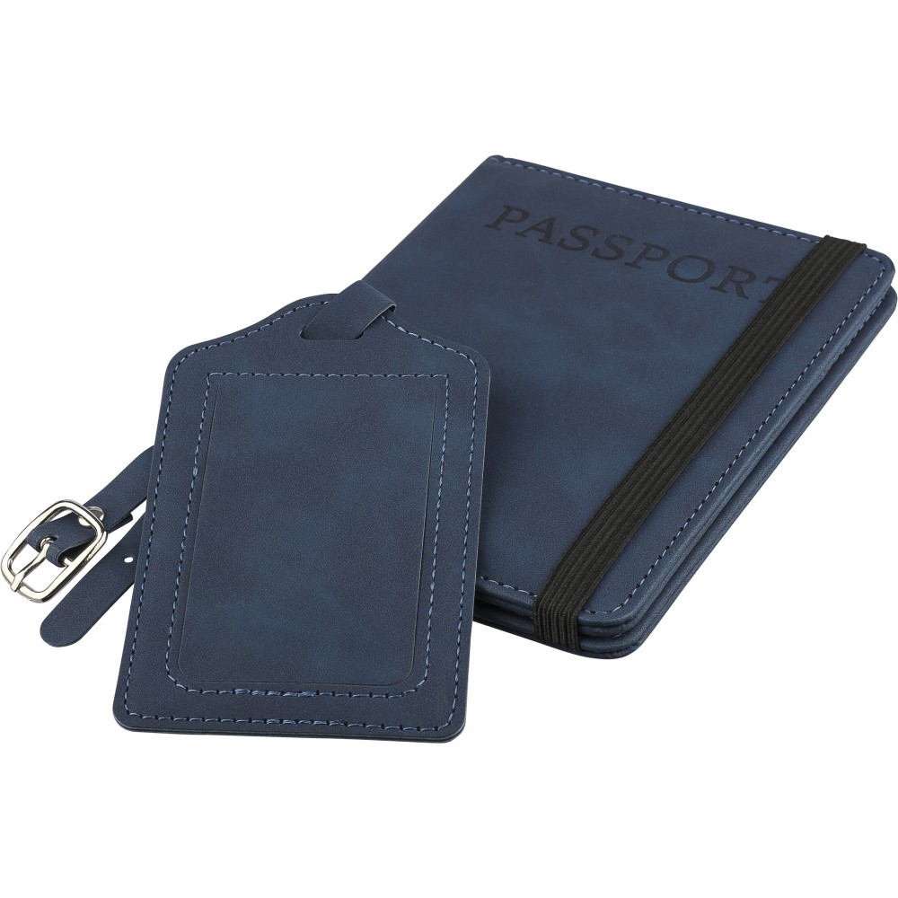 Újrahasznosított PU anyagból készült útlevéltartó és poggyászcímke, illusztrációval ellátott barna kartondobozban. Az útlevéltartó elülső oldalán "Passport" felirat található, belül két rekesszel az útlevél biztonságos rögzítéséhez. Mindkét terméken dombornyomott, újrahasznosított alapanyagra utaló logó található.