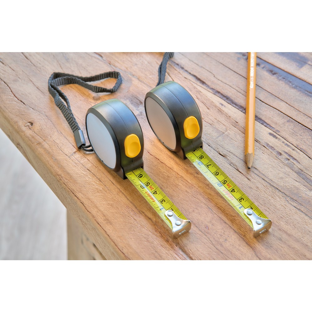 ABS műanyagból készült mérőszalag mágneses oldallal, 3 m hosszúságú és 16 mm szélességű fém szalaggal, centiméter- és inch-beosztással. Felül elhelyezett nyomógomb a rögzítéshez/kioldáshoz, valamint poliészter csuklópánt. Egyenként csomagolva illusztrációval ellátott barna kartondobozba.