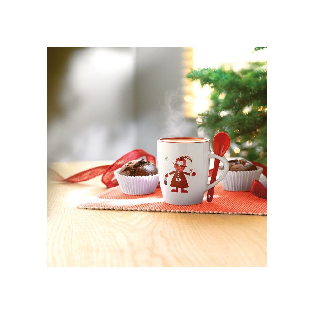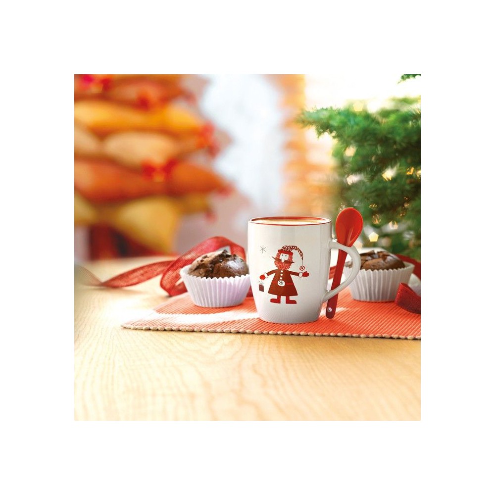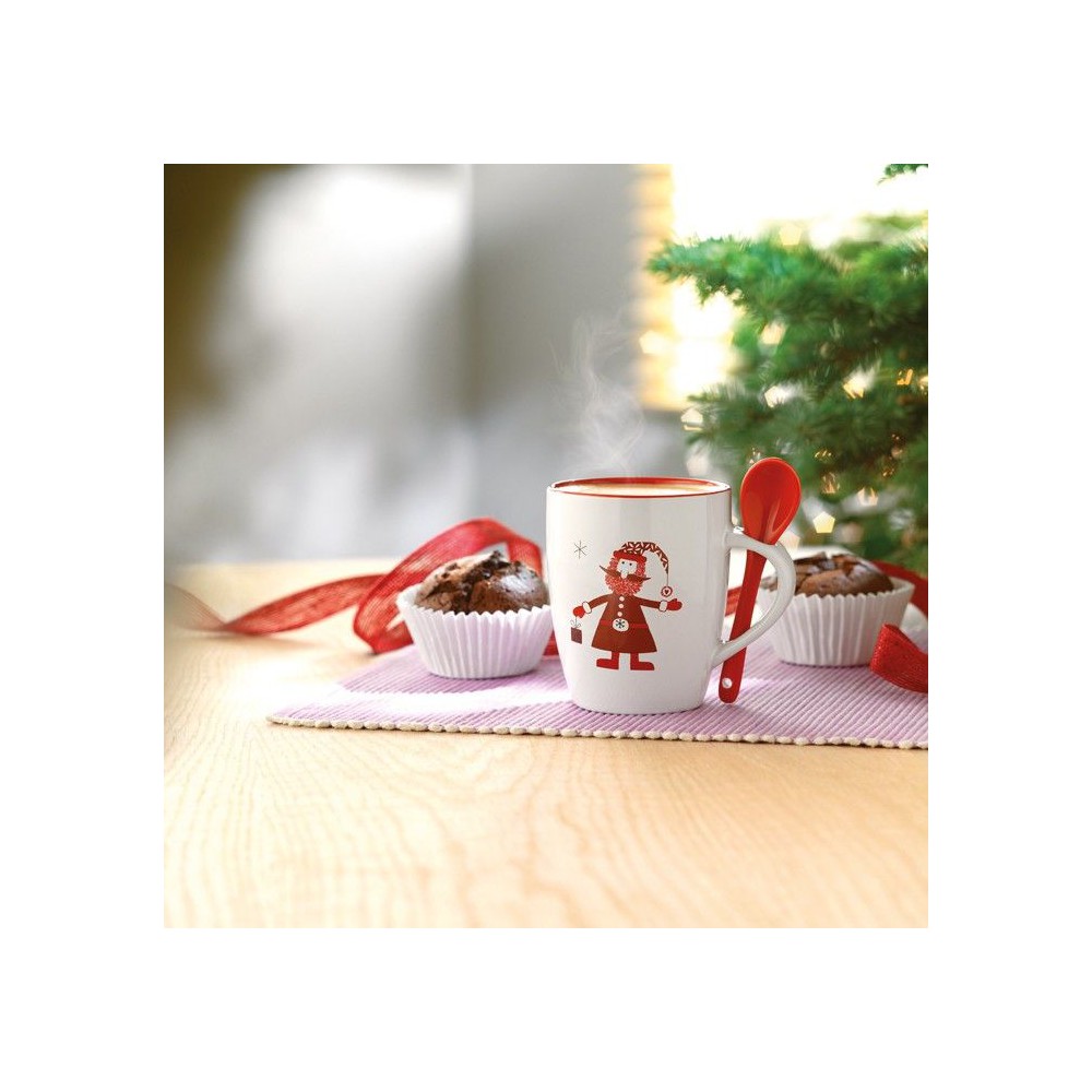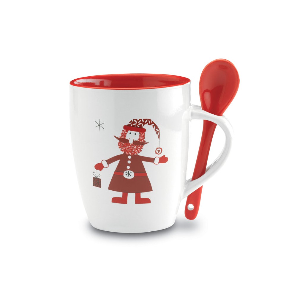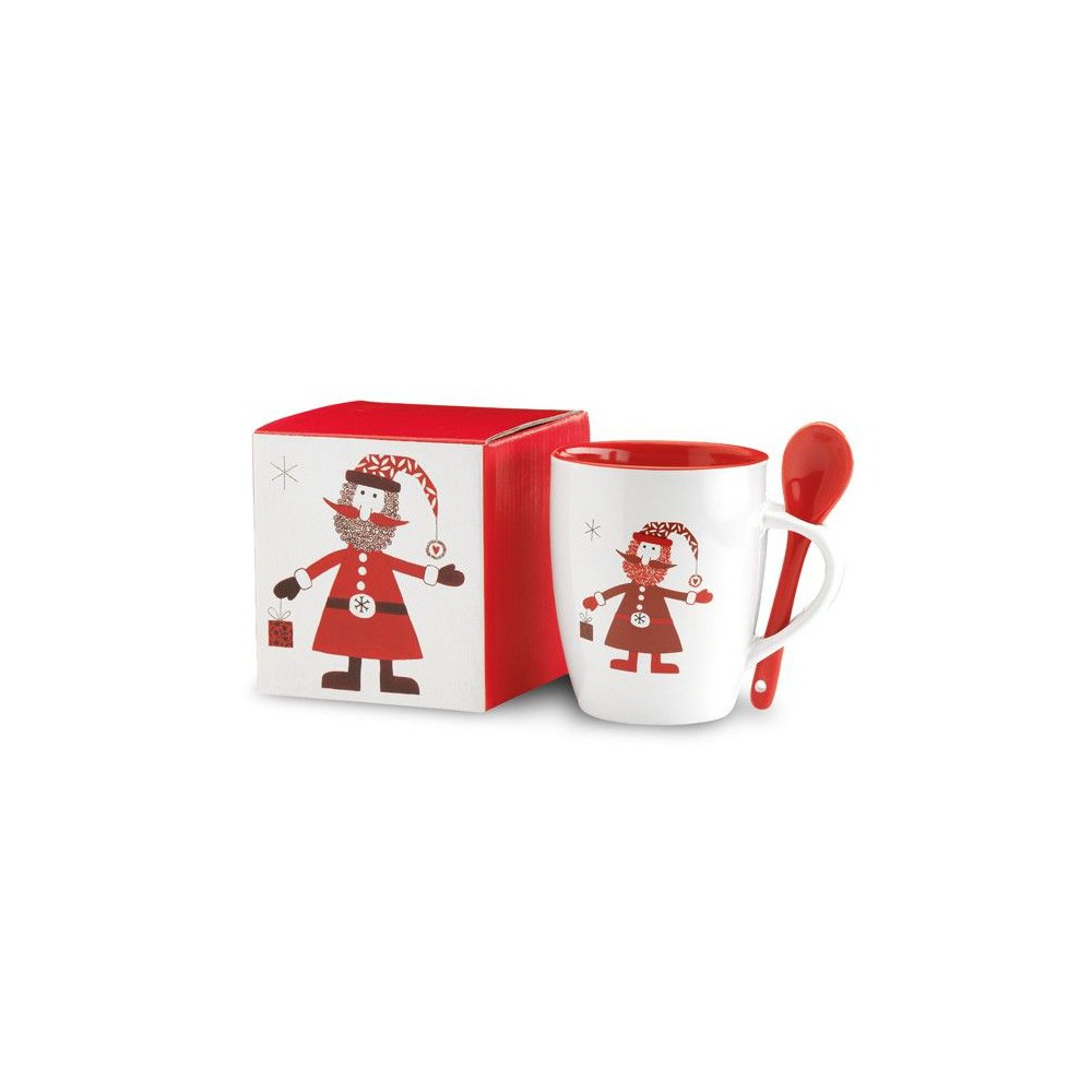 Kerámia kávésbögre kiskanállal, mikulás dekorációval, hozzáillő ajándékdobozban. 250ml.