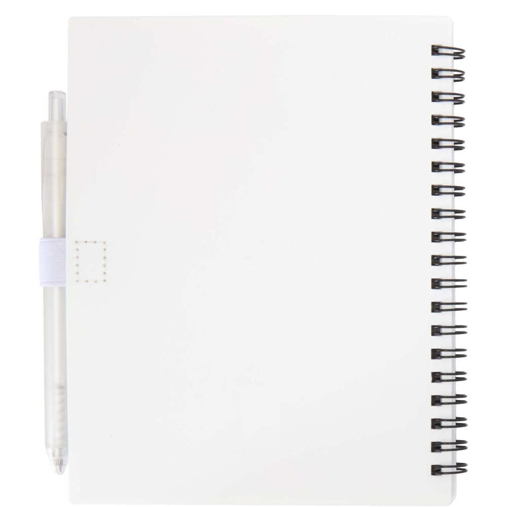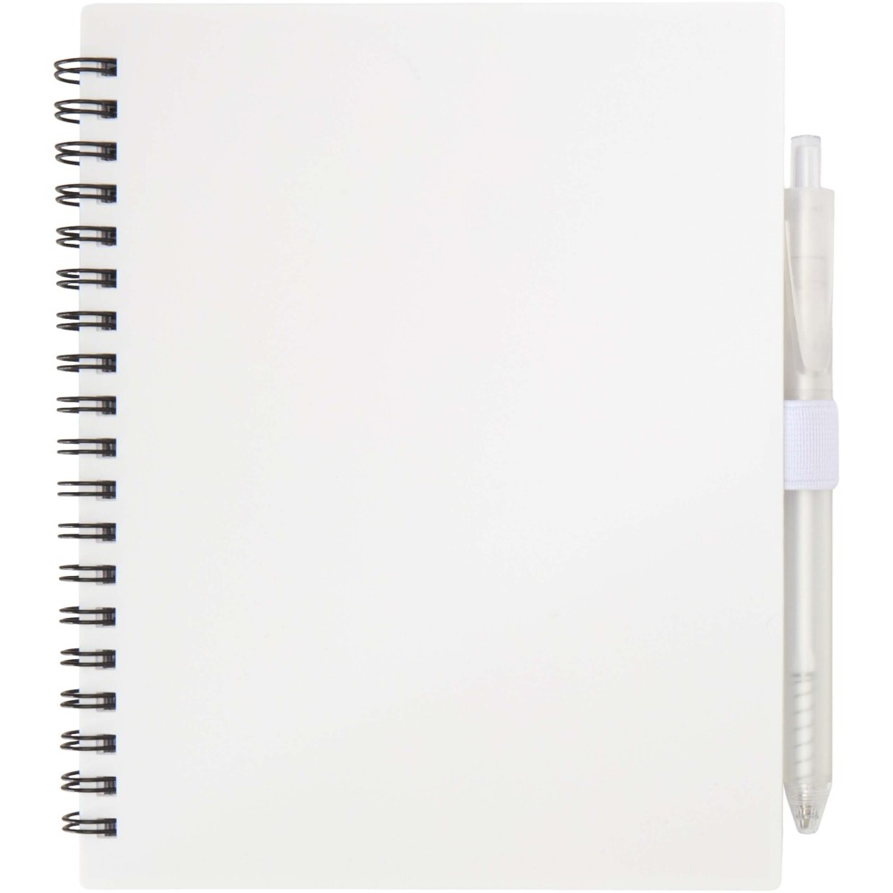 A Niove puhafedeles jegyzetfüzet újrahasznosított műanyagból készült, 70 darab, pontozott, 70 g/m2 papírlappal. A jegyzetfüzet sarkai lekerekítettek, és tolltartóhurokkal rendelkezik. Mérete: 140 × 178 mm. A golyóstoll szintén újrahasznosított műanyagból készült. Tollbetét színe: kék. Íráshossz: 1000 méter. Hegyméret: 1,0 mm.