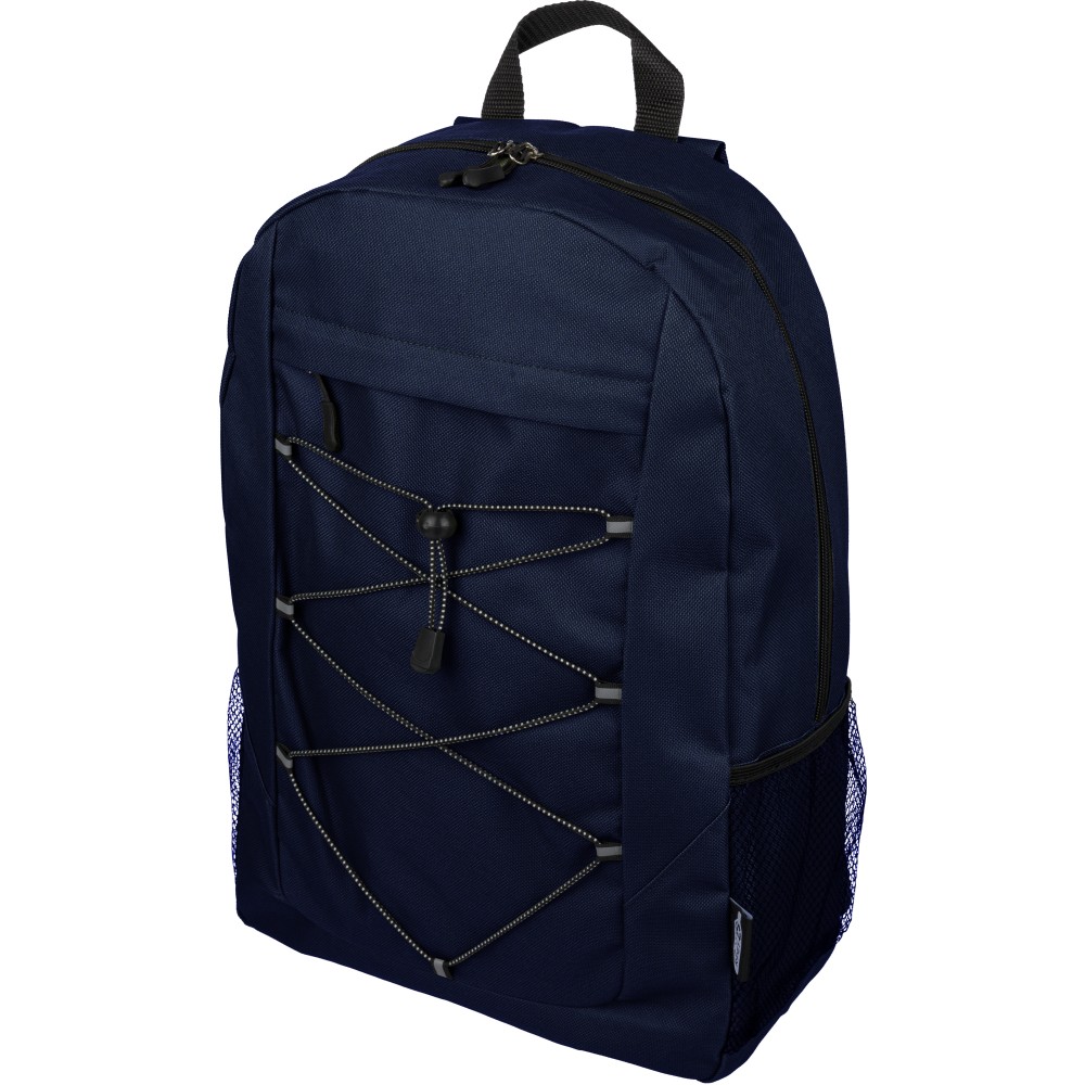 RPET poliészter 600D anyagból készült hátizsák húzózsinóros záródással és nagy cipzáras fő rekesszel. Hálós oldalzsebekkel, rugalmas elülső pántokkal, dekorációhoz kialakított kis elülső cipzáras zsebbel és állítható vállpántokkal rendelkezik. A terméken rPET alapanyagra utaló címke található.