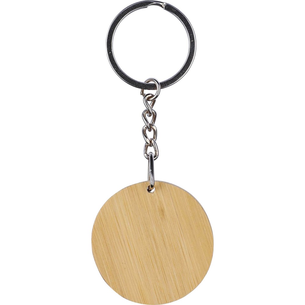 Kulcstartó gumis felületű, rozsdamentes acél gravírozólappal. A gravírozás utáni szín fényes króm. Egyedi csomagolásban, barna kraftpapír tokban. Anyaga: bambusz.