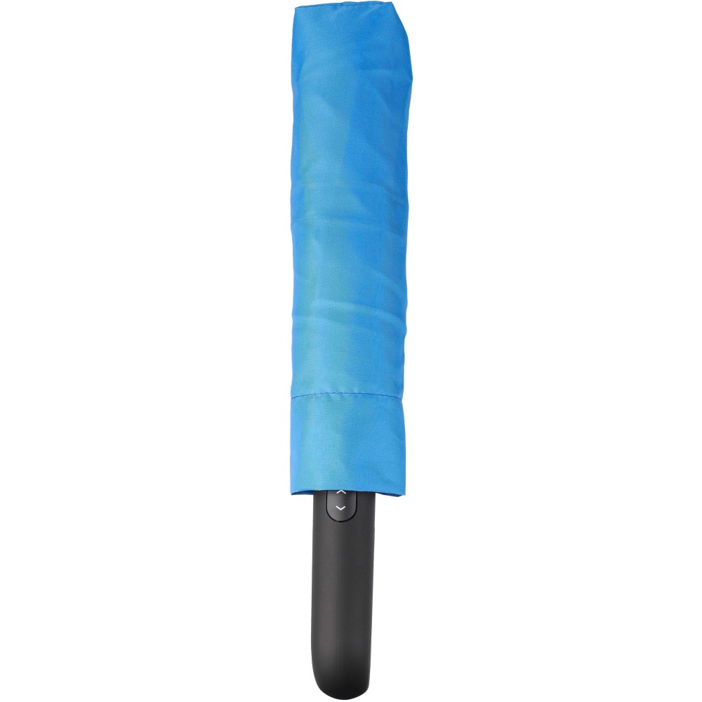 Összecsukható, automata esernyő (21 inch), hat panellel és acél vázzal. Az esernyő tépőzáras záródásán RPET címke található, műanyag karabineres fogantyúval, tokkal. Szélálló. Anyaga: RPET 190T.