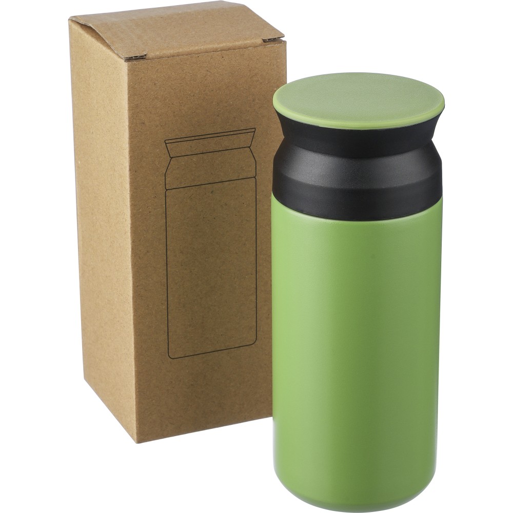 Duplafalú vákuumos bögre lapos PP fedéllel. Matt lakkozott. A belső rész 304-es rozsdamentes acélból, a külső rész 201-es rozsdamentes acélból készült. Könnyen nyitható PP mechanizmussal. A tartalmát 12 órán át melegen és 18 órán át hidegen tartja. Egyenként barna karton ajándékdobozba csomagolva. Űrtartalom: 350 ml.