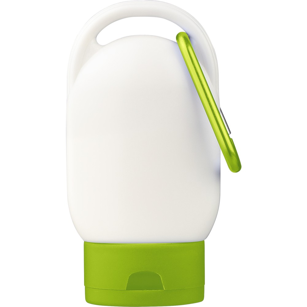SPF 30 faktorszámú naptej színes kupakkal és a kupak színével harmonizáló karabinerrel. A hátoldalon az összetevőlista és a minőségmegőrzési idő szerepel. Szavatossági ideje 2 év. 30 ml.